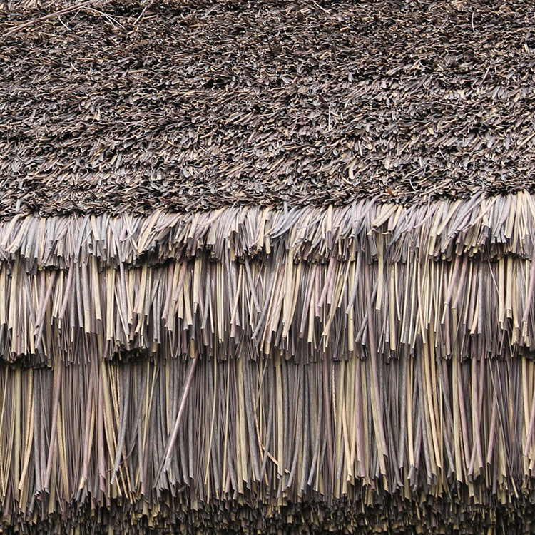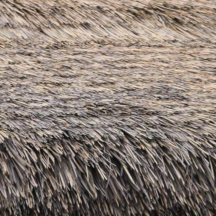 屋脊分斜脊和正脊,先將茅草鋪在斜脊兩側主面,然后同步從下向上進行鋪茅草,直至鋪出脊梁形狀,形成雨水從上向下流的導向,把屋面茅草瓦片鋪完就可以做正脊收口,這里斜脊和正脊茅草要把主屋面茅草壓住,可根據實際大小調整茅草瓦片的長短,可剪成小片茅草,便宜安裝,體現自然效果。鋪完屋脊兩邊再在屋脊正梁上鋪一排茅草,這樣整個茅草屋頂基本安裝完畢,剩下收尾部分,可根據自己的喜好效果,適當修飾調整。