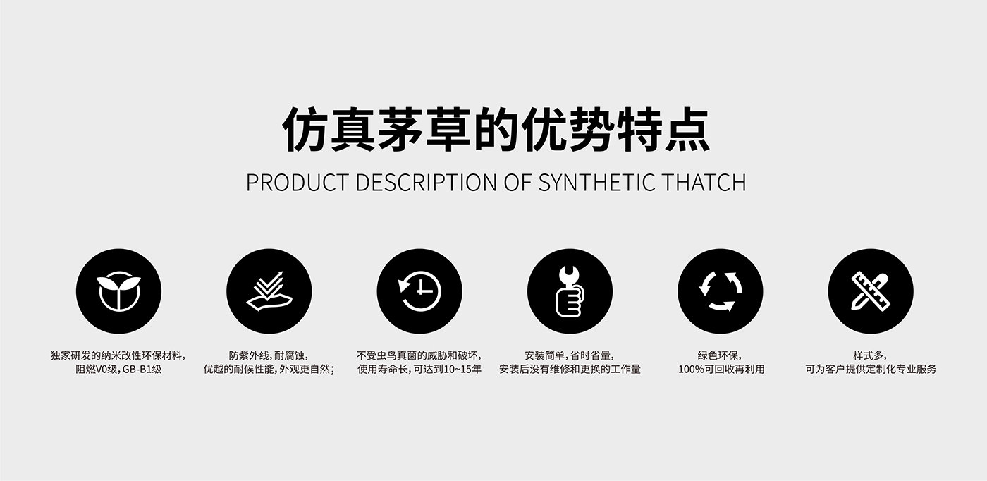 ? ? ? ? 仿真茅草是深圳市科佰工貿(mào)有限公司采用目前國際上先進(jìn)的納米合成高分子材料技術(shù)和工藝生產(chǎn)。利用納米粒子的特有的物理化學(xué)性質(zhì),使得其具有更加優(yōu)異的耐候性及阻燃性,能滿足美國ASTM-G154-06 抗UV老化測試標(biāo)準(zhǔn),并能通過美標(biāo)UL94-V0級阻燃,在國內(nèi)仿真茅草也通過了國家防火建材阻燃測試B1級。?