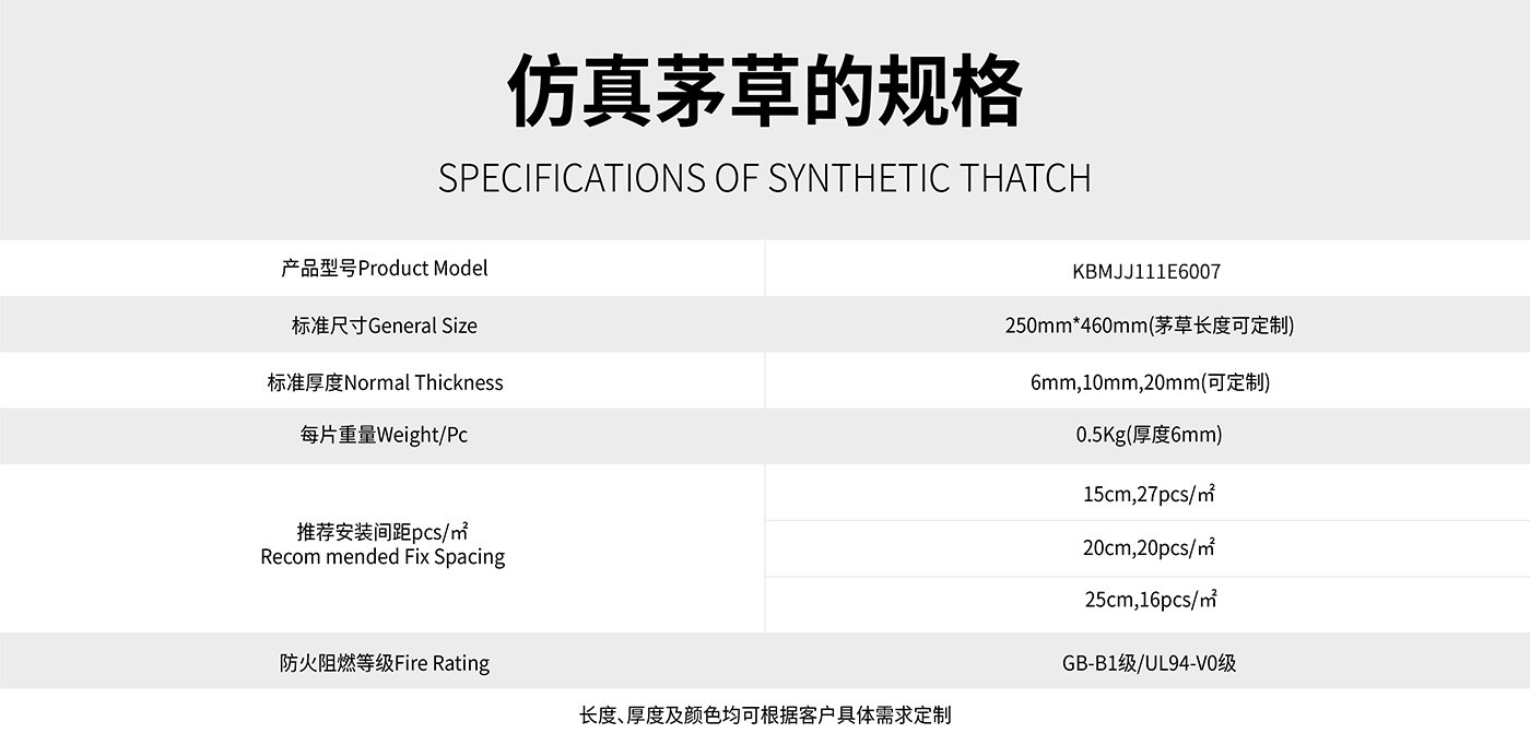 ? ? ? ? 仿真茅草是深圳市科佰工貿(mào)有限公司采用目前國(guó)際上先進(jìn)的納米合成高分子材料技術(shù)和工藝生產(chǎn)。利用納米粒子的特有的物理化學(xué)性質(zhì),使得其具有更加優(yōu)異的耐候性及阻燃性,能滿(mǎn)足美國(guó)ASTM-G154-06 抗UV老化測(cè)試標(biāo)準(zhǔn),并能通過(guò)美標(biāo)UL94-V0級(jí)阻燃,在國(guó)內(nèi)仿真茅草也通過(guò)了國(guó)家防火建材阻燃測(cè)試B1級(jí)。?