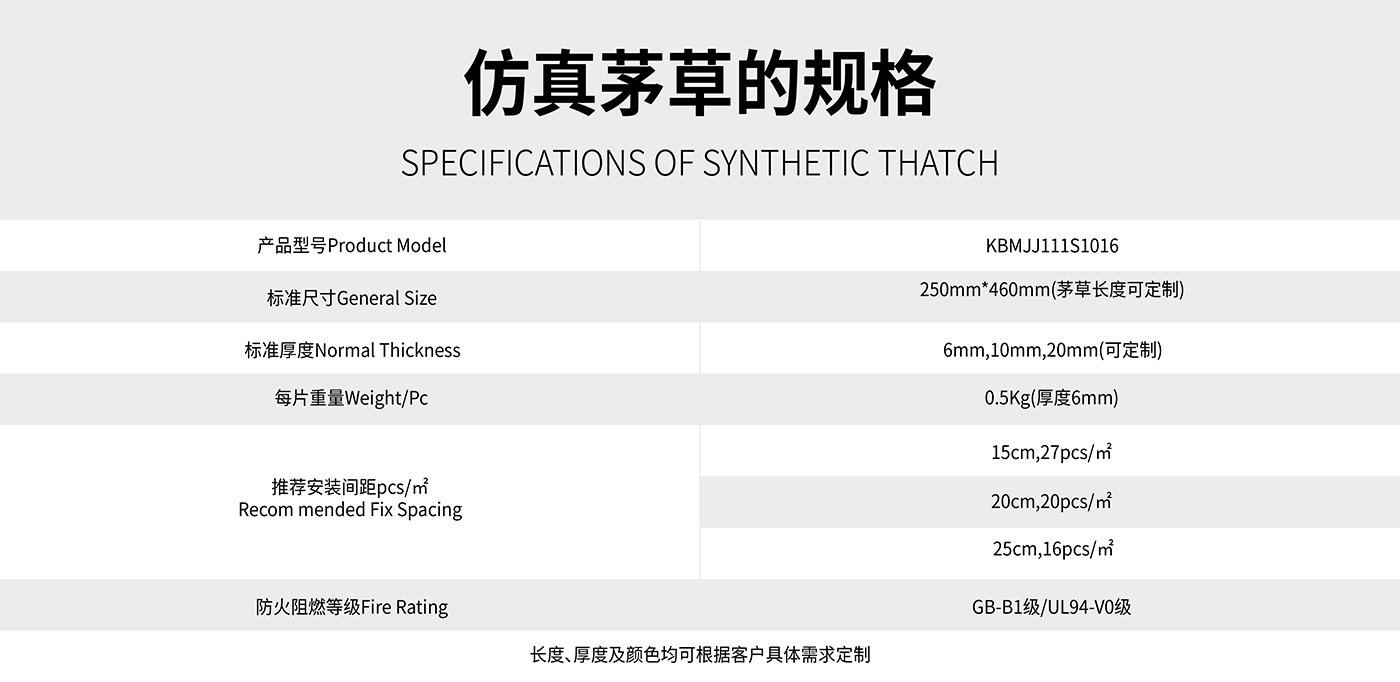? ? ? ? 仿真茅草是深圳市科佰工貿有限公司采用目前國際上先進的納米合成高分子材料技術和工藝生產。利用納米粒子的特有的物理化學性質,使得其具有更加優異的耐候性及阻燃性,能滿足美國ASTM-G154-06 抗UV老化測試標準,并能通過美標UL94-V0級阻燃,在國內仿真茅草也通過了國家防火建材阻燃測試B1級。?