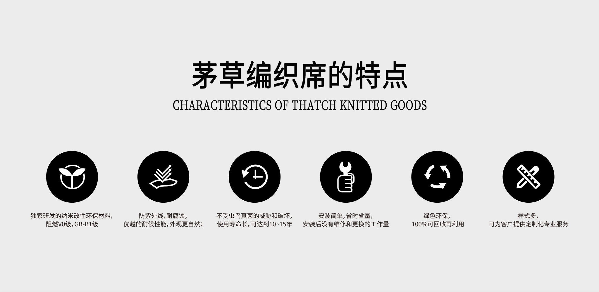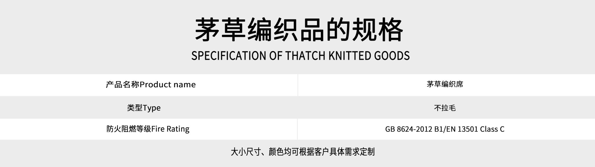 ? ? ? ? 茅草編織席是深圳市科佰工貿有限公司采用目前國際上先進的納米合成高分子材料技術和工藝生產。利用納米粒子的特有的物理化學性質,使得其具有更加優異的耐候性及阻燃性,能滿足美國ASTM-G154-06 抗UV老化測試標準,并能通過美標UL94-V0級阻燃,在國內茅草編織席也通過了國家防火建材阻燃測試B1級。?